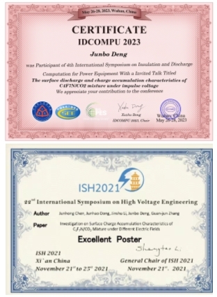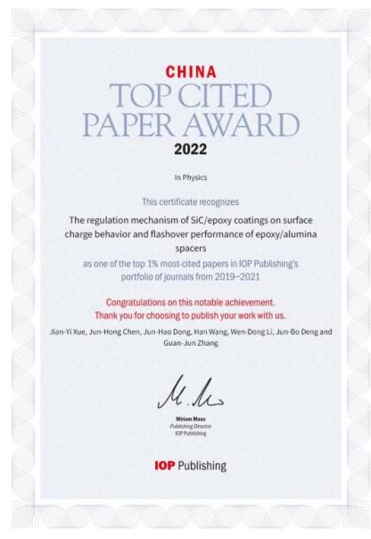 张冠军和邓军波团队长期从事气固界面电荷积聚及沿面闪络特性研究,在界面电荷积聚特性、沿面放电特性及沿面绝缘性能提升措施等方面取得了重要的成果,获得了国内外学术界的广泛关注。团队此前开展的非线性电导涂层对绝缘子表面电荷积聚及沿面闪络性能的影响研究,所得成果发表在Journal of Physics D: Applied Physics(J. Phys. D, 2019,52(40): 405502),并获得2022年IOP Publishing的前1%高被引荣誉。团队开展了正极性冲击电压下沿面正向放电和反向放电及其电荷积聚特性研究,研究成果发表在Journal of Applied Physics 上 (J. Appl. Phys., 2022, 131: 033302)并成为JAP的封面论文。团队针对新型环保气体C4F7N/CO2的沿面放电特性开展研究,并在Applied Physics Letters发表两篇研究文章(Applied Physics Letters, 2022, 120: 061601和2022, 121: 171602)。此外,C4F7N/CO2混合气体中的表面电荷积聚特性研究成过在2021年ISH国际会议上交流,获评大会“优秀海报”,并在IEEE PES学会主办的IDCOMPU2023国际会议上做了特邀报告。
