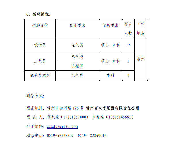 【就业信息】中国西电集团-常州西电变压器有限责任公司